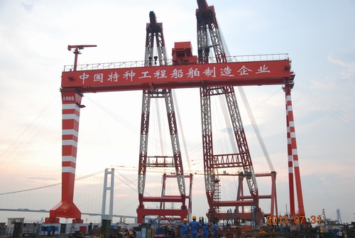 On 31st July 2013, our company has successfully installed the main beam of a 700t gantry crane. Boasting a 90m-long track gauge, the crane has a hook height of at most 60m and a lifting capacity of at most 700t. It has also become one of the important facilities in our third development step and listed as a special programme of Jiangsu strategic newly-developed industry. Despite the trough of shipbuilding market, our company still made this investment decision because it can help us to grasp the future opportunity, accelerate the transformation of our product structure, accumulate more resources for future development and pursuit a long-term advancement. It will surly strengthen our lifting capacity for ocean engineering vessels and improve our erection level of the 50,000-tonne slipway, thus further propel the our development momentum towards a modern shipbuilding enterprise and raise the overall shipbuilding level of our company. |