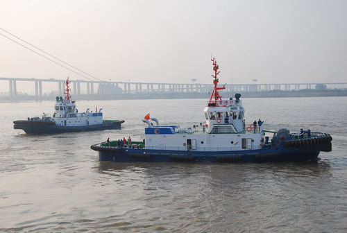 On the afternoon of October 22nd 2014, two 2×1618kw ASD tugboats, built for Tangshan Cao Feidian Tug Co.,Ltd, were successfully delivered from Zhenjiang Shipyard (Group) Co., Ltd, starting their sail smoothly. |