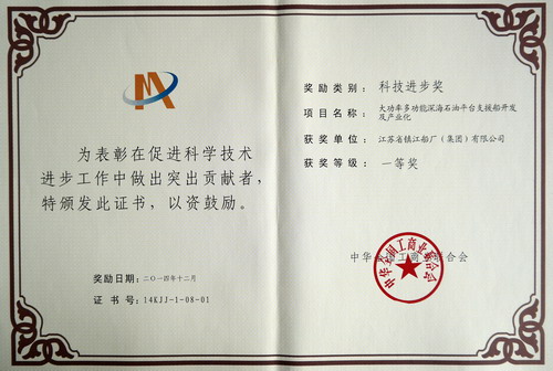 On the afternoon of March 6, 2015, Zhenjiang Shipyard’s self-developed project of Industrialization and Development of Big Power and Multi-functional Support Vessel for Deep Sea Oil Drilling Platform, was awarded as the first prize in terms of scientific advancement by Chinese National Federation of Industry and Commerce. At the Eleventh Session of the Fourth Executive Meeting of Zhenjiang Federation of Industry and Commerce, Mr. Huan Xiangbao, deputy chairman of Zhenjiang Political Consultative Conference and minister of Zhenjiang Civil Controlling Department honored this prize to the yard.