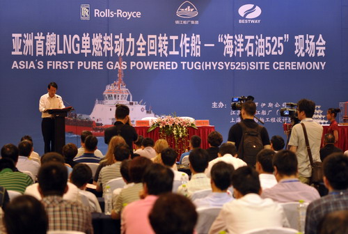 On July 3, 2015, the Asia’s first pure gas powered ASD tugboat HYSY525 was successfully delivered to China National Offshore Oil Corporation from Zhenjiang Shipyard. Around 100 representatives from the corporation, Rolls-Royce, Shanghai Bestway Ship Design Company, China Rescue and Salvage of Ministry of Transport, and 40 national ports attended the site ceremony.