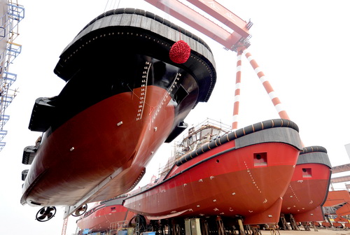 At 8th September 2016,4 nos of ASD tugboats which are self-designed and manufactured by Jiangsu Zhenjiang Shipyard (Group) Co., Ltd for SDIC CAOFEIDIAN PORT Co. Ltd and QINGDAO PORT INTERNATIONAL co ., LTD were successfully launched by lifting. This time 4 nos of ASD tugboats were lifted for launching at the same day created the new record of Zhenjiang Shipyard since 65 years and also created the new history of domestic ship-building company which have the maximum quantity of tugboat’s launching by lifting at the same day. |