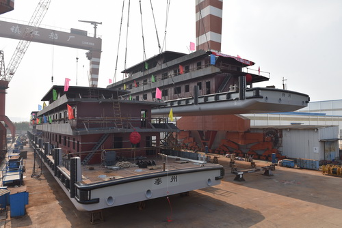 On Sep. 29th, 2019, three units of 60m Wharf Boats , which named as “SU HAI SHI DUN 30”, “SU HAI SHI DUN 303”and “SU HAI SHI DUN 505” and built for Jiangsu MSA, was lifted to launching. |