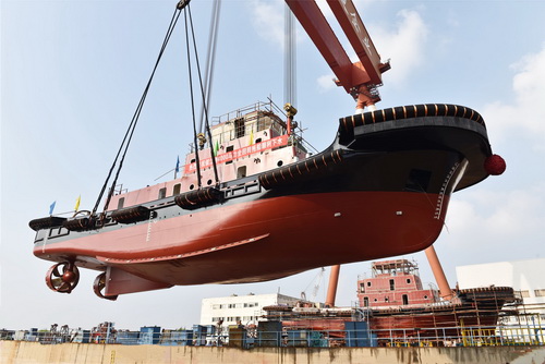 【下水】我公司2942kW全回轉(zhuǎn)拖輪順利吊裝下水