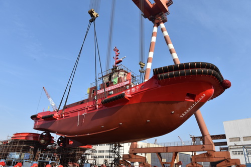 【下水】我公司3824kW全回轉(zhuǎn)消拖兩用船順利吊裝下水