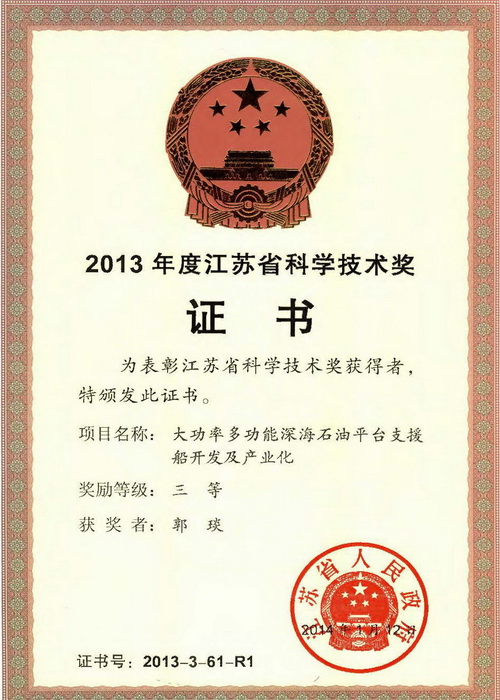 江蘇省科技進(jìn)步三等獎(jiǎng)證書(shū)