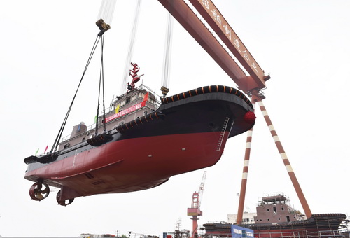 【下水】我公司3234kW全回轉(zhuǎn)消拖兩用船順利吊裝下水