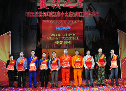 在前不久由鎮(zhèn)江市委宣傳部、文明辦、國資委、總工會等幾家單位聯(lián)合主辦的鎮(zhèn)江市第一屆“十大杰出職工”評選活動中,我廠船體車間電焊工吳軍(左三)榜上有名,光榮當選。 |