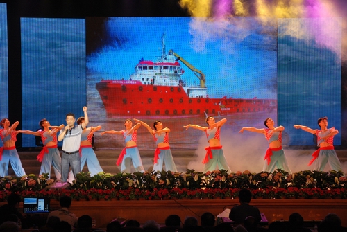 圖為鎮(zhèn)江船廠百名職工合唱團(tuán)演唱《在希望的田野上》。