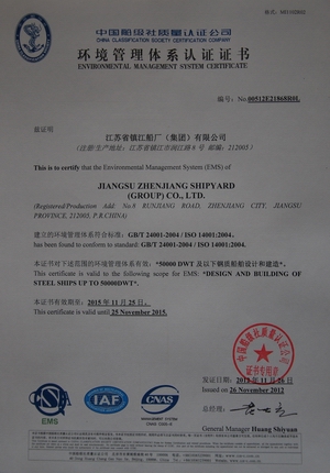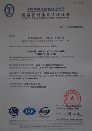 2012年12月5日,江蘇省鎮(zhèn)江船廠(集團(tuán))有限公司正式收到中國(guó)船級(jí)社質(zhì)量認(rèn)證公司頒發(fā)的質(zhì)量管理體系、環(huán)境管理體系、職業(yè)健康和安全管理體系的認(rèn)證證書(shū)。 |