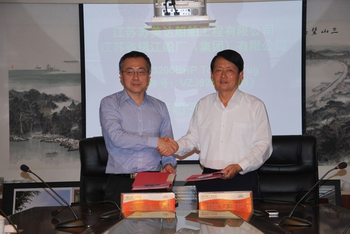 2013年5月13日,由江蘇省鎮(zhèn)江船廠(集團(tuán))有限公司為江蘇蘇美達(dá)船舶工程有限公司批量建造的3200BHP拖船首制船“MBP 3209”順利交付。江蘇蘇美達(dá)船舶工程有限公司總經(jīng)理徐剛先生出席了交船簽字儀式。 |
