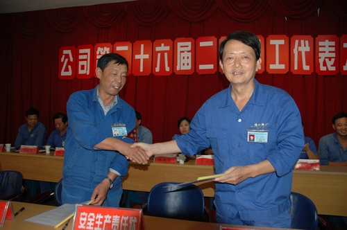 圖為公司董事長、總經理郭琰與分管副總簽訂《安全生產責任狀》