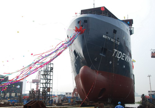 2014年8月22日下午,由江蘇省鎮(zhèn)江船廠(集團(tuán))有限公司為美國(guó)潮水公司批量建造的全電力推進(jìn)海洋石油平臺(tái)供應(yīng)船第三艘船在鎮(zhèn)江船廠順利下水。 |