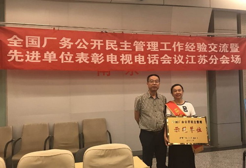 2017年9月29日,在北京召開的全國廠務(wù)公開民主管理工作經(jīng)驗交流暨先進單位表彰電視電話會議上,我公司被中組部、人社部、全國總工會聯(lián)合表彰為“全國廠務(wù)公開民主管理示范單位”,并在江蘇分會場接受了表彰。 |