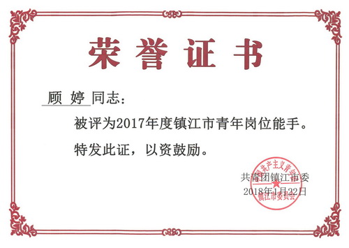 【榮譽(yù)】顧婷同志榮獲“鎮(zhèn)江市青年崗位能手”榮譽(yù)稱號