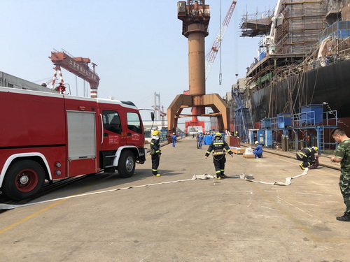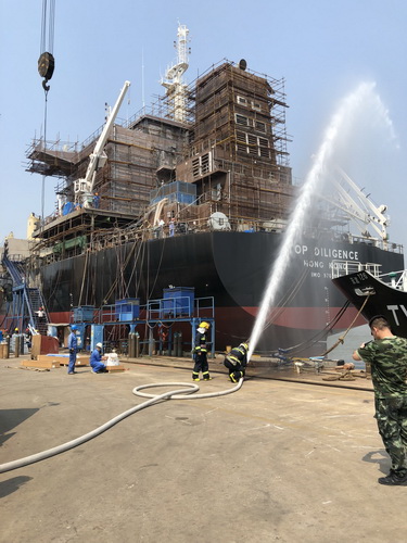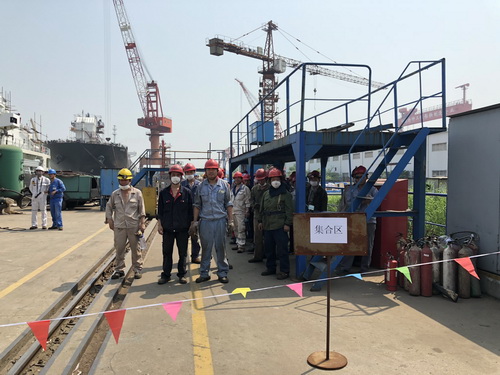 近日,在鎮(zhèn)江市潤州消防大隊七里甸消防中隊的指導與參與下,作為公司“雙安全月”活動之一,我公司安保部在廠區(qū)舾裝碼頭48500DWT3#船的施工現場舉行了“消防和應急疏散演練”。來自七里甸消防中隊,公司安全科、保衛(wèi)科、義務消防隊、48500DWT3號船項目組及施工人員約150人參加本次演練活動。