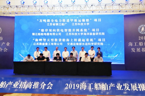 2019年5月31日,在鎮(zhèn)江市海工船舶產(chǎn)業(yè)招商推介會暨2019海工船舶產(chǎn)業(yè)發(fā)展報告會上,我公司與江蘇科技大學(xué)簽訂了“萬噸級全電力推進(jìn)甲板運輸船”項目產(chǎn)學(xué)研合作開發(fā)協(xié)議。