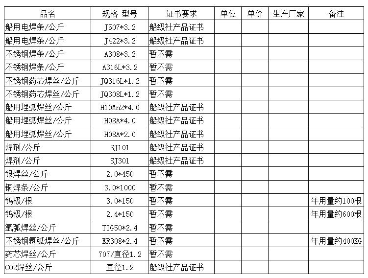 【信息】焊接材料采購(gòu) 因船舶建造需要,本公司需常年采購(gòu)焊接材料(具體規(guī)格見下列附表)。交貨地點(diǎn):江蘇省鎮(zhèn)江市京江路8號(hào),江蘇省鎮(zhèn)江船廠(集團(tuán))有限公司倉(cāng)庫(kù)。
